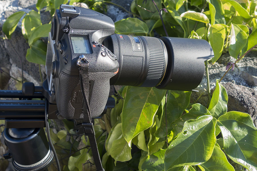 Now that I've shown the camera, I might as well say what it is, for those who don't recognize it: Nikon D810, with the Nikkor 105mm f/2.8 mounted. I'm shooting almost directly into the sun, so I mounted the sunshade. Usually for macro photography it's not needed.
