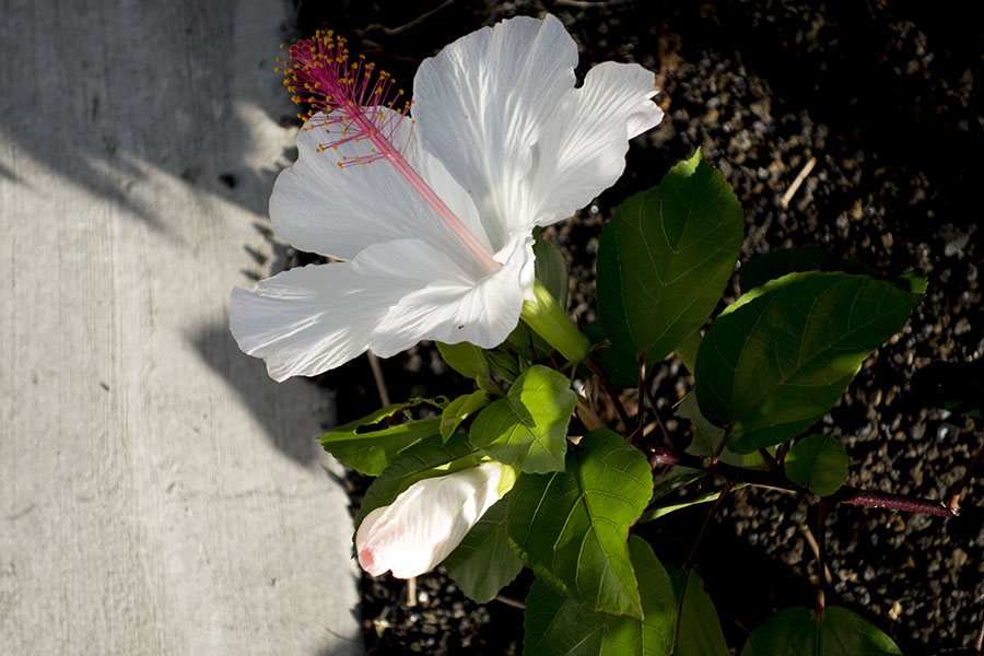 This is the entire bud, branch, and another (opened) hibiscus. As you can see, the part I shot is small. Getting the camera and the focusing rail (yeah, the lens alone isn't enough) and tripod down that low was a chore, but I managed it.